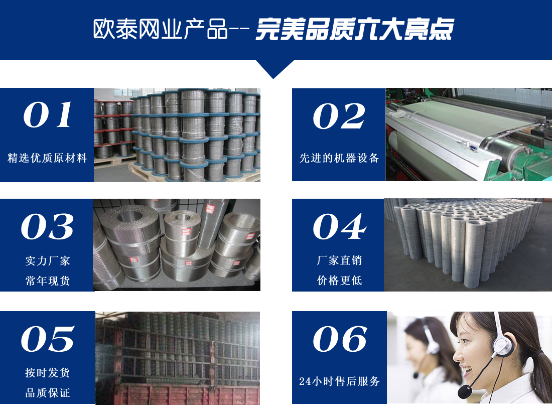 河北省安平縣歐泰五金網(wǎng)業(yè)有限公司座落于聞名全國(guó)的絲網(wǎng)之鄉(xiāng)河北省安平縣,是一家集科研,生產(chǎn), 經(jīng)營(yíng),銷售為一體的綜合性企業(yè)。我廠技術(shù)力量雄厚,采用優(yōu)質(zhì)原材料,嚴(yán)把質(zhì)量關(guān),主要絲網(wǎng)產(chǎn)品:編織系列:不銹鋼 絲網(wǎng),鐵絲網(wǎng),電鍍鋅鐵絲網(wǎng),熱鍍鋅鐵絲網(wǎng),包塑鐵絲網(wǎng),窗紗,,輸送網(wǎng),合股網(wǎng),勾花網(wǎng),六角網(wǎng),石籠網(wǎng),銀絲,銀網(wǎng)。護(hù) 欄網(wǎng):護(hù)攔網(wǎng)、公路護(hù)欄網(wǎng),鐵路護(hù)欄網(wǎng),機(jī)場(chǎng)護(hù)欄網(wǎng),工廠防護(hù)網(wǎng),小區(qū)防護(hù)網(wǎng),電焊網(wǎng),電焊網(wǎng)片,聚脂網(wǎng)系列:聚脂成型 網(wǎng)、聚脂單絲干網(wǎng)、印刷網(wǎng)。金屬板網(wǎng):鋼板網(wǎng)、鎳板網(wǎng),鋁板網(wǎng),沖孔網(wǎng)主要應(yīng)用于工業(yè),石油,化工,建筑,紡織,醫(yī) 藥,航天,航空,養(yǎng)殖,冶金機(jī)械等多個(gè)領(lǐng)域,我廠技術(shù)力量雄厚,設(shè)備先進(jìn),檢測(cè)方法齊全,產(chǎn)品質(zhì)量穩(wěn)定....